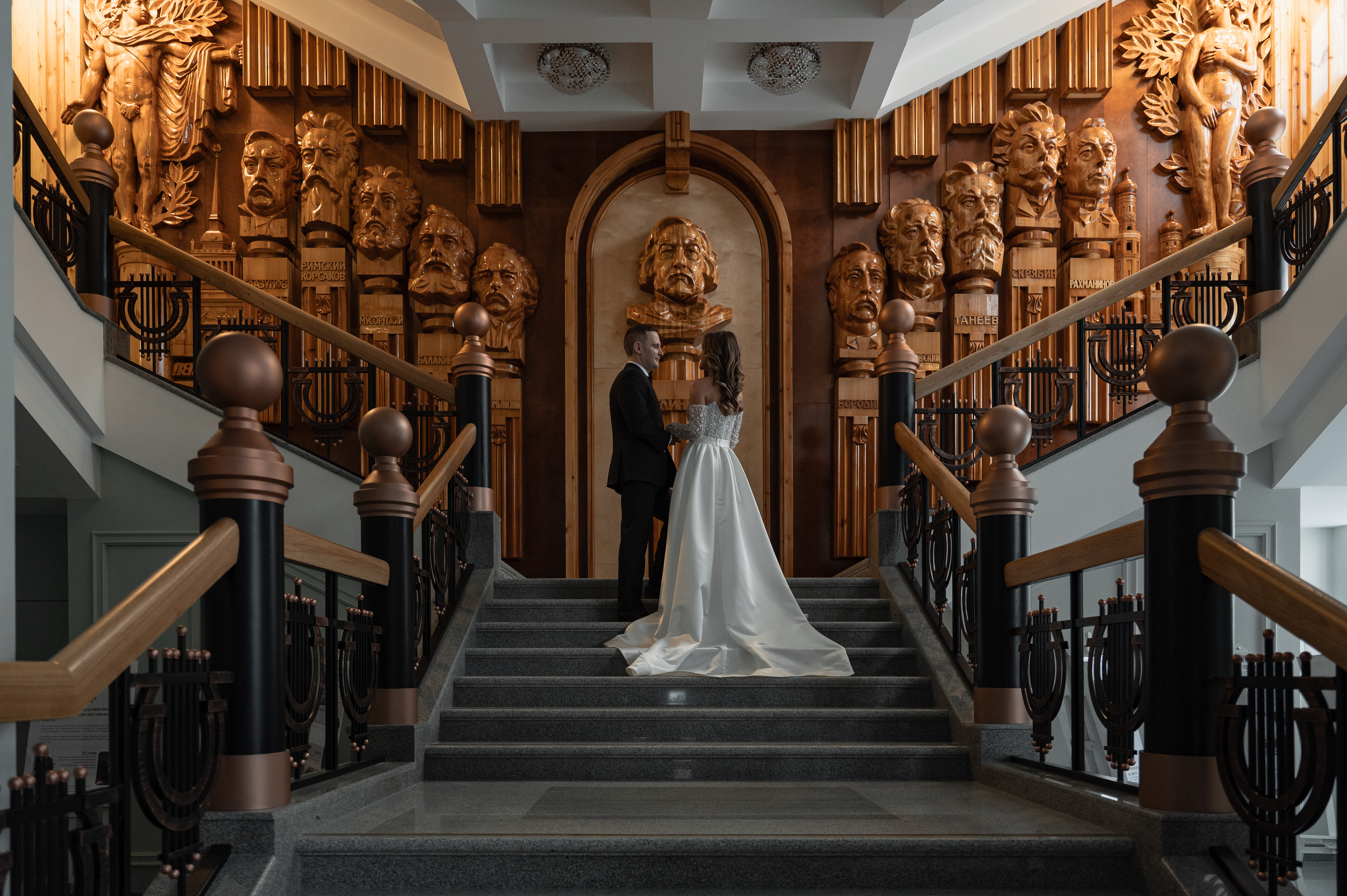 Все просто — пара музыкальная, оба играют на барабанах и увлекаются различными жанрами музыки. И консерватория со своей архитектурой идеально подходила для свадебной фотосессии
